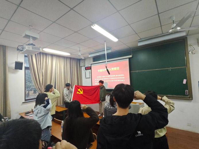 仪式在庄严激昂的《义勇军进行曲》中拉开帷幕,全体人员肃立奏唱国歌,嘹亮的歌声凝聚起对党和国家的无限忠诚与崇高敬意。随后,在新学员代表、2023级本科生李阳的领誓下,全体新党员面向鲜红的中国共产党党旗,高举右拳,庄严宣誓:“我志愿加入中国共产党,拥护党的纲领,遵守党的章程……” 铿锵有力的誓言回荡在会场,既是对党的郑重承诺,更是对初心使命的坚定践行,让每一位新党员接受了深刻的党性洗礼与精神淬炼。