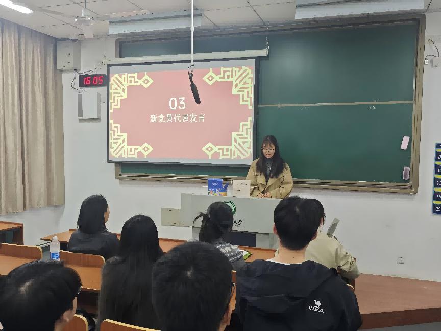 新党员代表、土木工程专业2022 级本科生华曼琪同学上台发言。她表示,能够成为党组织的一员,既是荣誉更是责任,她倍加珍惜此次培训机会,将以饱满的热情、严谨的态度投入学习,在理论修养上补短板、在实践锻炼上求实效,始终以党员标准严格要求自己,在学习科研、志愿服务、社会实践中发挥先锋模范作用,努力成为可堪大用、能担重任的时代新人,不辜负党组织的培养与期望。
